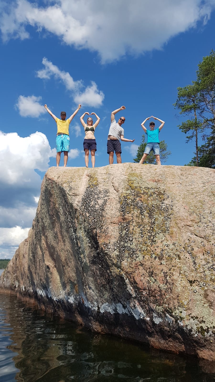 Das haben wir natürlich so geplant, dass wir uns bestmöglich von unserem stressigen Alltag erholen konnten. Deshalb sah unser Tagesplan meist wie folgt aus: Frühstück (von einigen fast täglich übersprungen), Nichts tun, Mittagessen, Nichts tun, Abendessen, Nichts tun und dann Abendabschluss. Wobei "Nichts tun" natürlich nicht immer gleich nichts tun bedeutet. Meistens verbrachten wir unseren Tag einfach so, wie jeder einzelne es wollte. Beispielsweise den ganzen Tag am See liegen und schwimmen, Kajak fahren, lesen oder in der Sonne dösen, Spiele spielen und Trampolin springen. Dabei trieben wir auch viel Blödsinn und manch einer fuhr so weit mit dem Kajak weg, dass er selbst Angst hatte den Weg zurück nicht mehr zu finden. An regnerischen Tagen gab es natürlich auch entspanntes "Nichts tun" in Form von auf dem Sofa gammeln, Kaffee im Haus kochen oder saunieren.